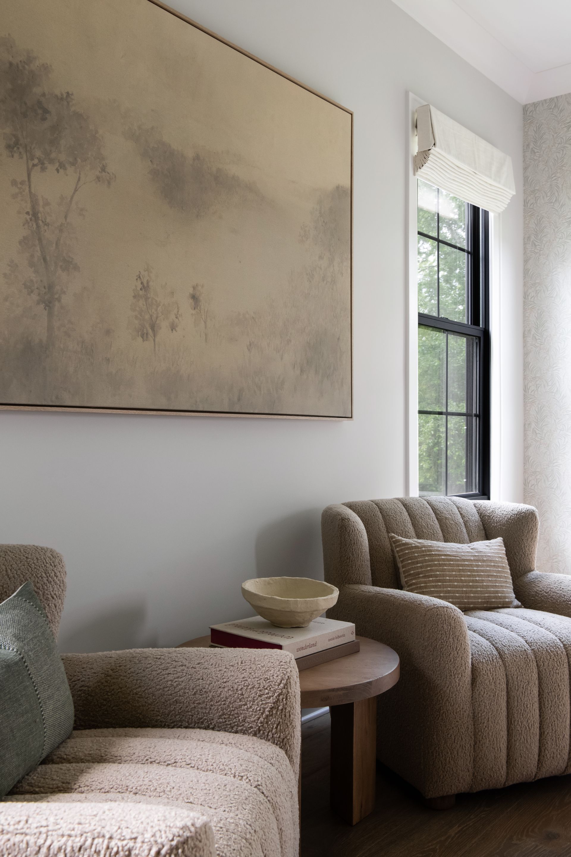 Sometimes, two-sided fireplaces can be tricky. We fixed that with a simple, intimate seating space and gorgeous artwork! ? @charlotteleaphotography