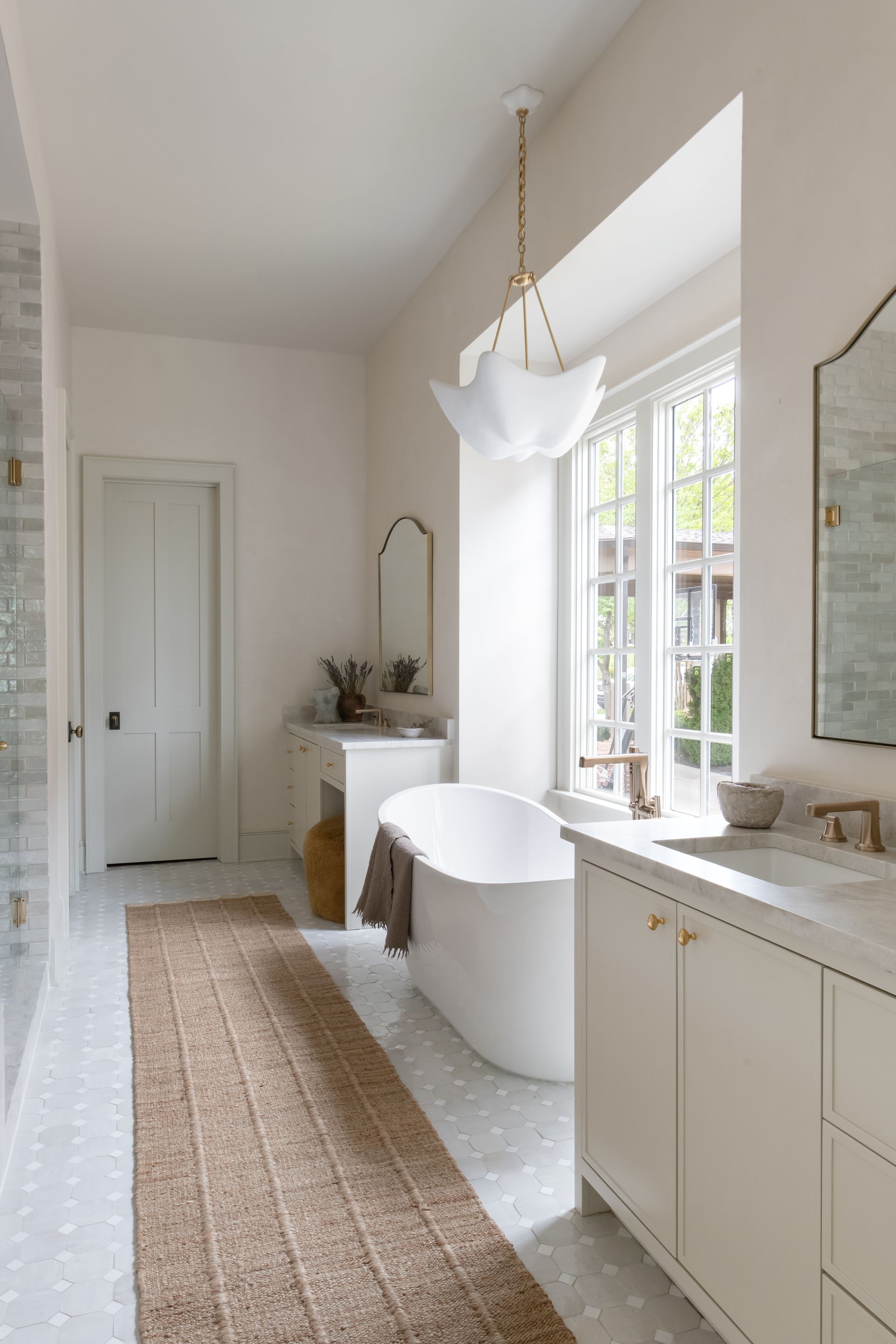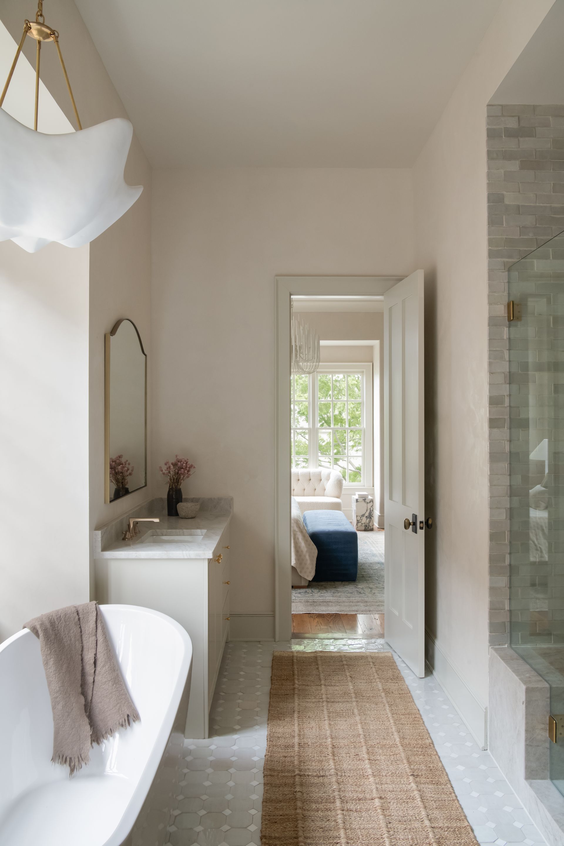 Grounding the space with natural texture, sandstone floors that bring warmth and timeless character to the master bath 🤍 #interiordesign | #interiordesigner | #nashville | #homedecor | #victoriaforehandesign | #earthyelegance | #sandstone